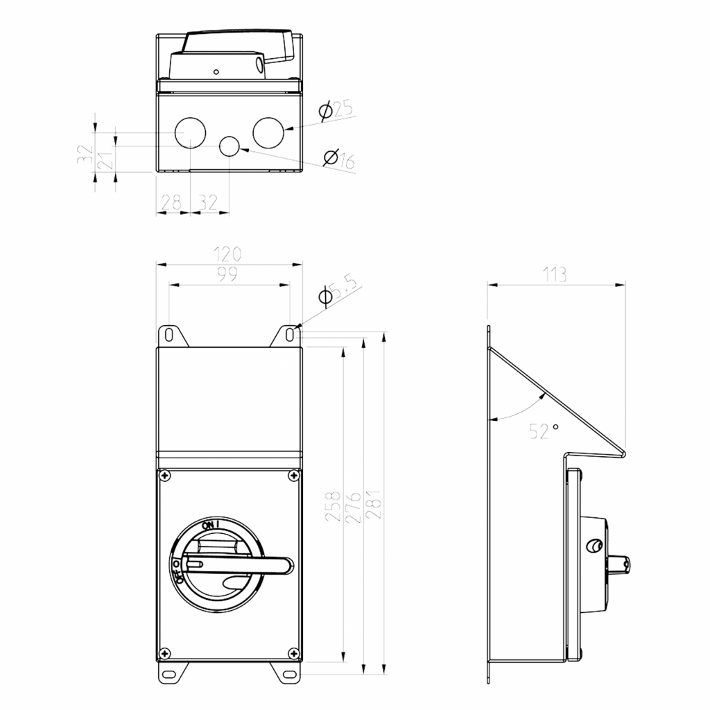 3-pole, IP69K, Acid-resistant stainless steel enclosure with rain hood (AISI 316L); W120 x H258 x D113, Cable entries: 2 x plug, plastic; 1 x plug, metal