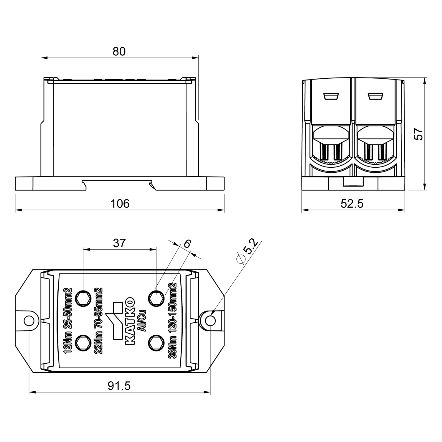 12 (25 - 50 mm²) / 22 (70 - 95 mm²) / 38 (120 - 150 mm²)