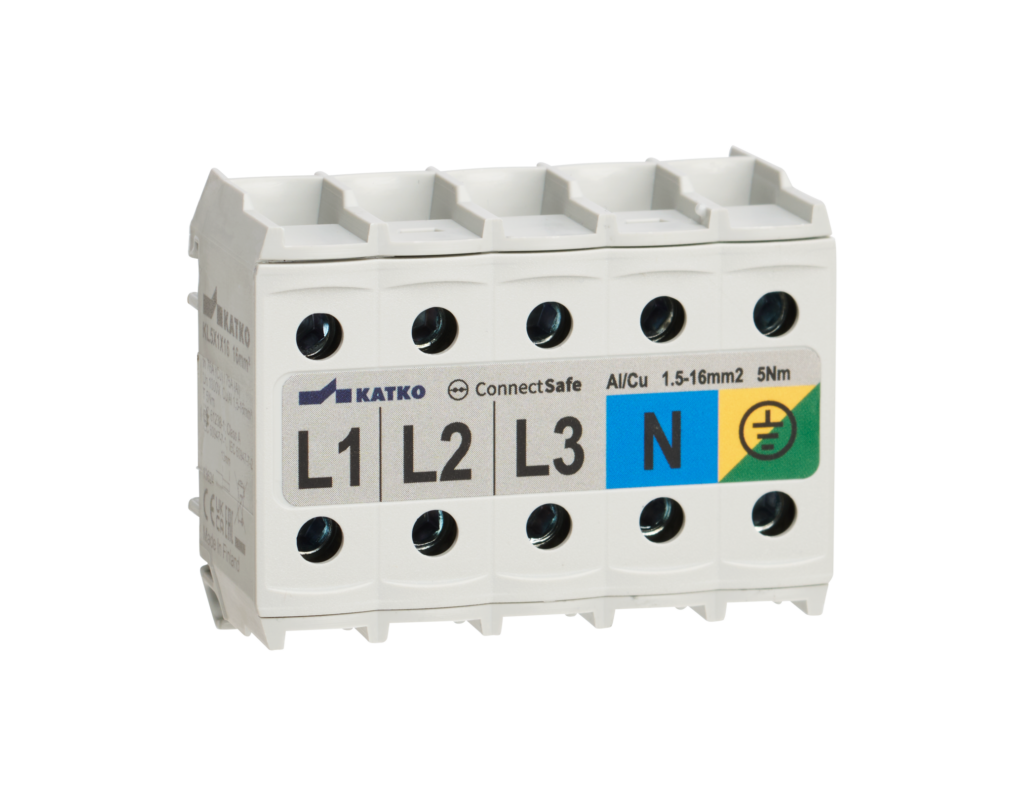 Katko ConnectSafe terminal blocks provide safe and reliable electrical connections for demanding industrial and building applications. Suitable for both copper and aluminum conductors, they are available with screw and DIN-rail mounting options, enabling fast and easy installation. Their robust construction and clear design ensure long service life and trouble-free operation. ConnectSafe terminals meet high industry standards and international approvals, delivering dependable performance for professional use.