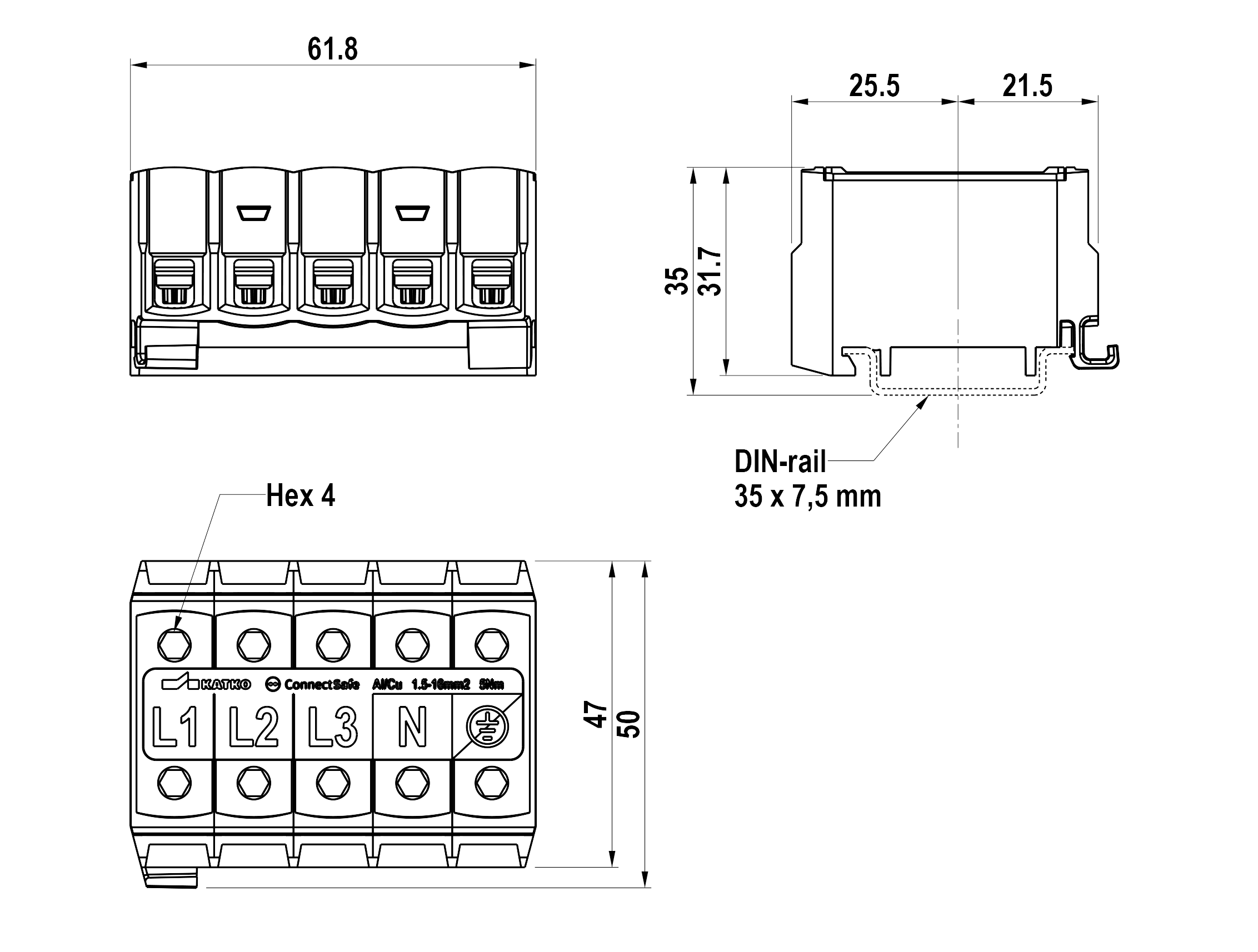 Terminal block KL 5x1xAl/Cu 1,5-16mm2 3L, N, PE