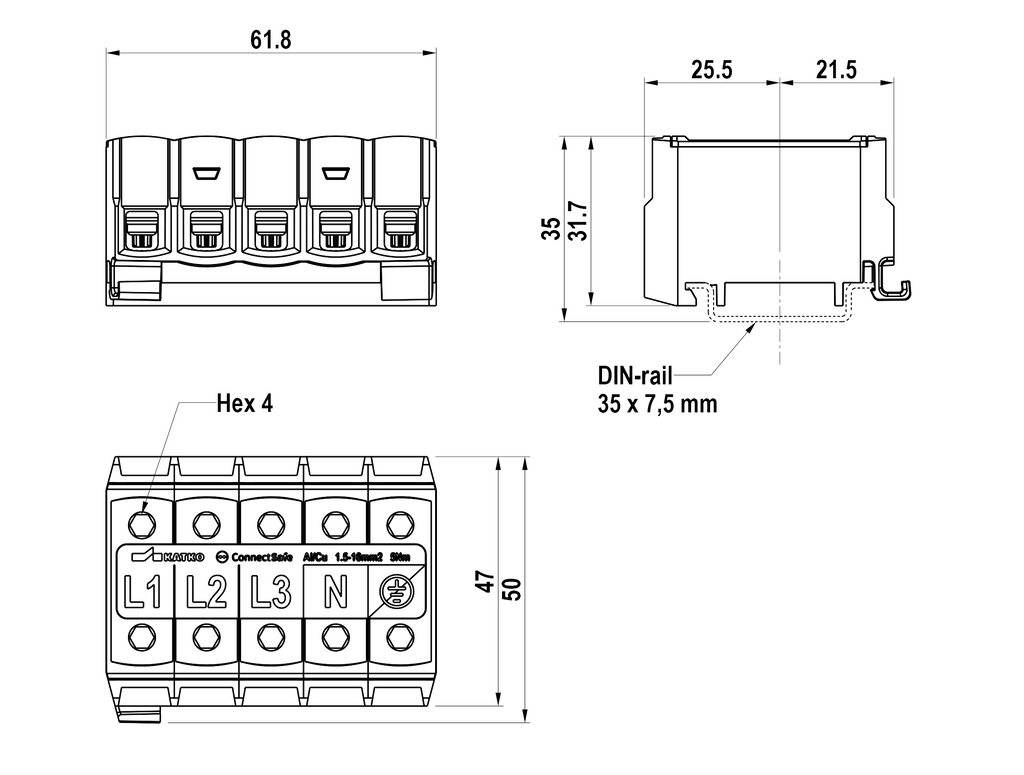 KL5X1X16Terminal block KL 5x1xAl/Cu 1,5-16mm2 3L, N, PE